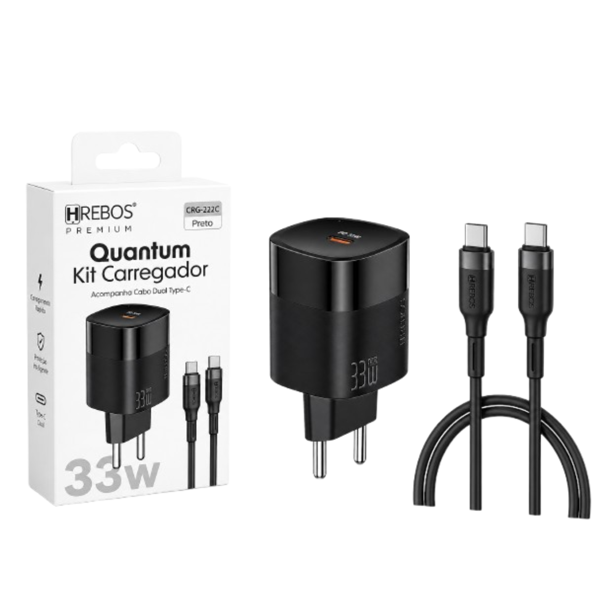 Potencialize a recarga dos seus dispositivos com o Kit Carregador Quantum da Hrebos. Desenvolvido com tecnologia de ponta, este carregador oferece uma potência real de 33W, garantindo que seu smartphone ou tablet carregue na velocidade máxima suportada, reduzindo drasticamente o tempo na tomada.